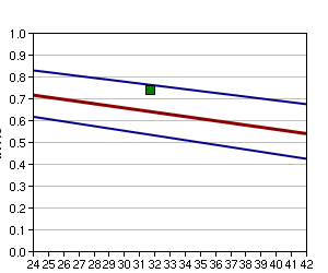 | |  | | Edad Gest. | 5p | 50p | 95p |  | 20 | 1.24 | 1.61 | 1.98 |  | 21 | 1.29 | 1.71 | 2.12 |  | 22 | 1.34 | 1.79 | 2.25 |  | 23 | 1.37 | 1.87 | 2.36 |  | 24 | 1.4 | 1.93 | 2.45 |  | 25 | 1.43 | 1.98 | 2.53 |  | 26 | 1.44 | 2.01 | 2.59 |  | 27 | 1.45 | 2.04 | 2.63 |  | 28 | 1.45 | 2.05 | 2.66 |  | 29 | 1.44 | 2.06 | 2.67 |  | 30 | 1.43 | 2.05 | 2.67 |  | 31 | 1.41 | 2.03 | 2.65 |  | 32 | 1.38 | 2 | 2.62 |  | 33 | 1.34 | 1.95 | 2.56 |  | 34 | 1.3 | 1.9 | 2.5 |  | 35 | 1.25 | 1.83 | 2.41 |  | 36 | 1.19 | 1.75 | 2.31 |  | 37 | 1.13 | 1.66 | 2.2 |  | 38 | 1.05 | 1.56 | 2.07 |  | 39 | 0.98 | 1.45 | 1.92 |  | 40 | 0.89 | 1.32 | 1.76 |